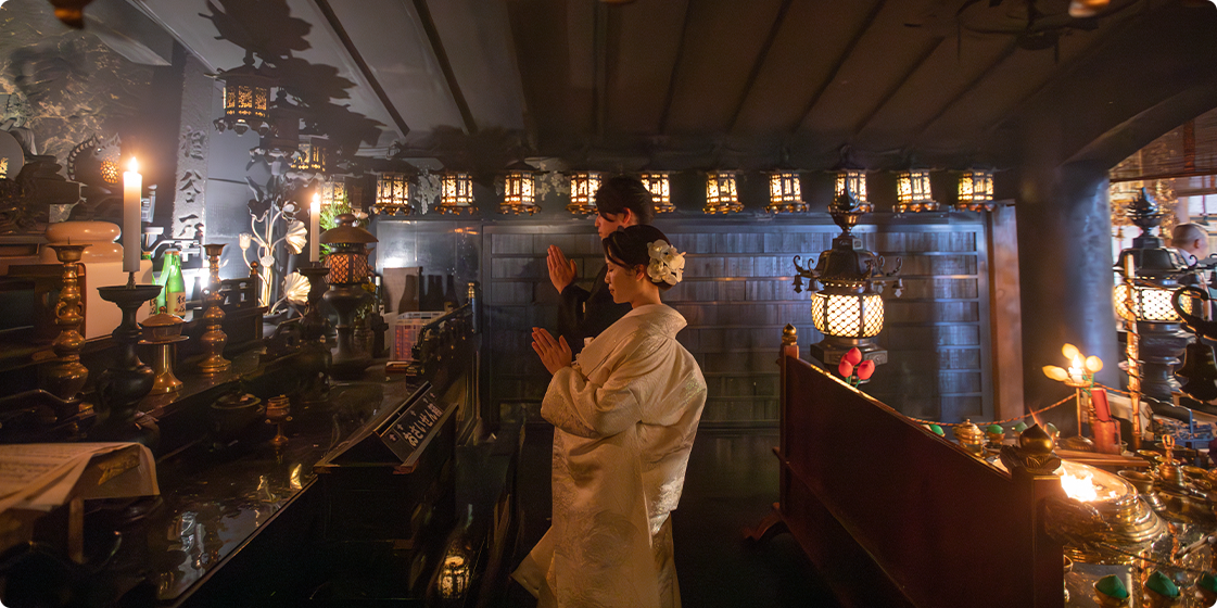 千年の都・京都に佇む霊験あらたかな寺院、大本山 狸谷山不動院にて二人の未来を、不動明王の御前で祈願し、写真に刻む―