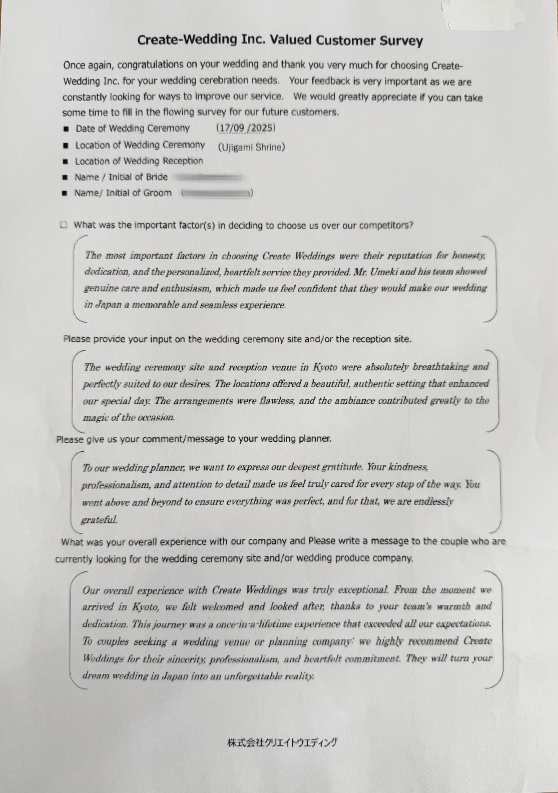 The most important factors in choosing Create Weddings were their reputation for honesty, dedication, and the personalized, heartfelt service they provided. Mr. Umeki and his team showed genuine care and enthusiasm, which made us feel confident that they would make our wedding in Japan a memorable and seamless experience.