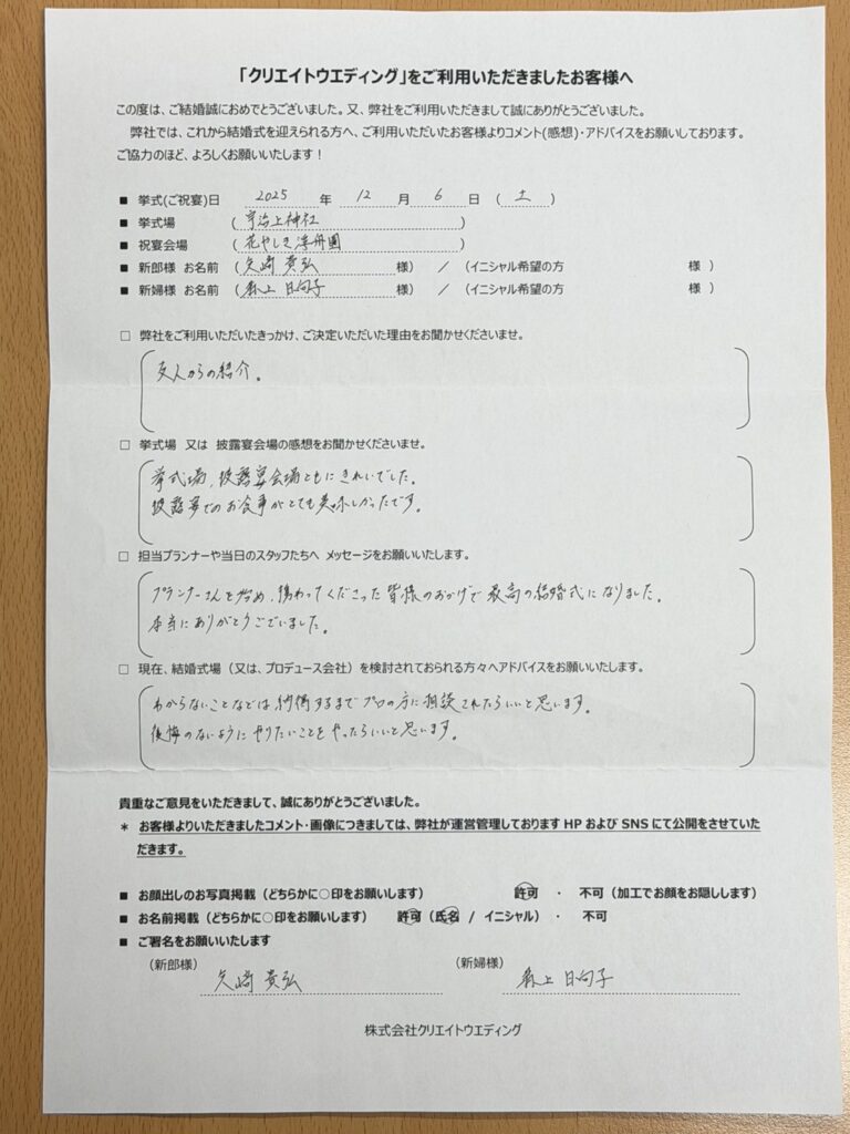 12月6日 宇治上神社にて挙式を挙げられたお客様より、メッセージをいただきました。