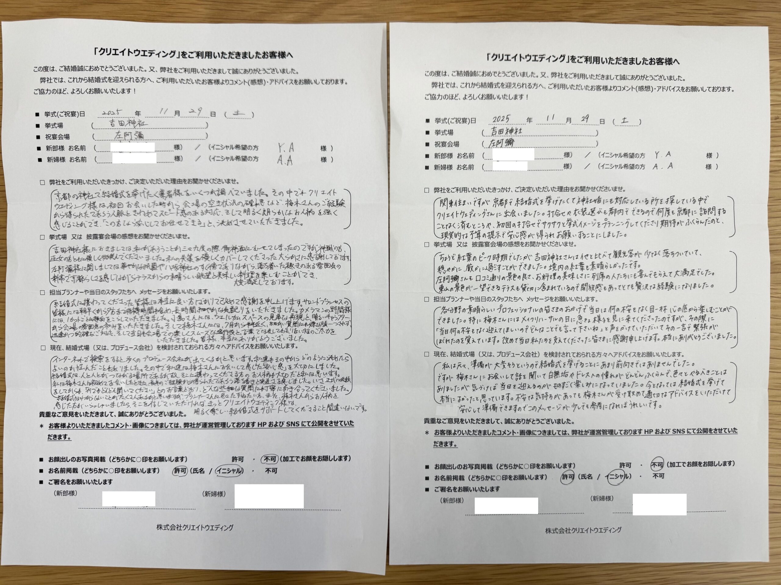 11月29日 吉田神社にて挙式を挙げられたお客様より、メッセージをいただきました。